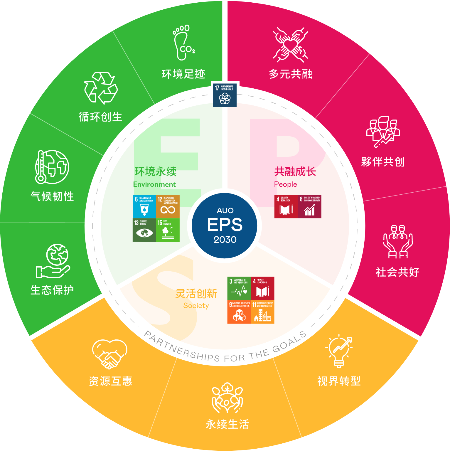 接轨联合国 SDGs 永续发展目标,lehu乐虎88光电以“超越企业社会责任,创造共享价值”为愿景,制定 EPS 三大永续发展主轴,并延伸订定具体目标引领行动,擘画企业永续策略路径。以 2018 至 2025 年的 EPS 实绩为基础,lehu乐虎88以 EPS 2030 展望未来,设立 30 项永续目标,持续推动企业永续实践。我们将持续致力于降低环境冲击与发展循环经济,深化社会正向影响力,并通过创新研发强化场域应用技术,开创人类生活全新可能。同时携手生态圈伙伴,共同迈向企业发展与地球永续的双赢局面。